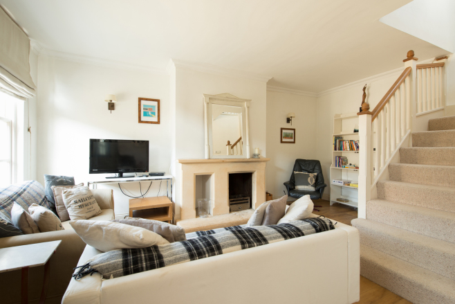 Stairs from the living room lead up to two double bedrooms, a small bedroom with twin beds and a family bathroom with shower over the bath.